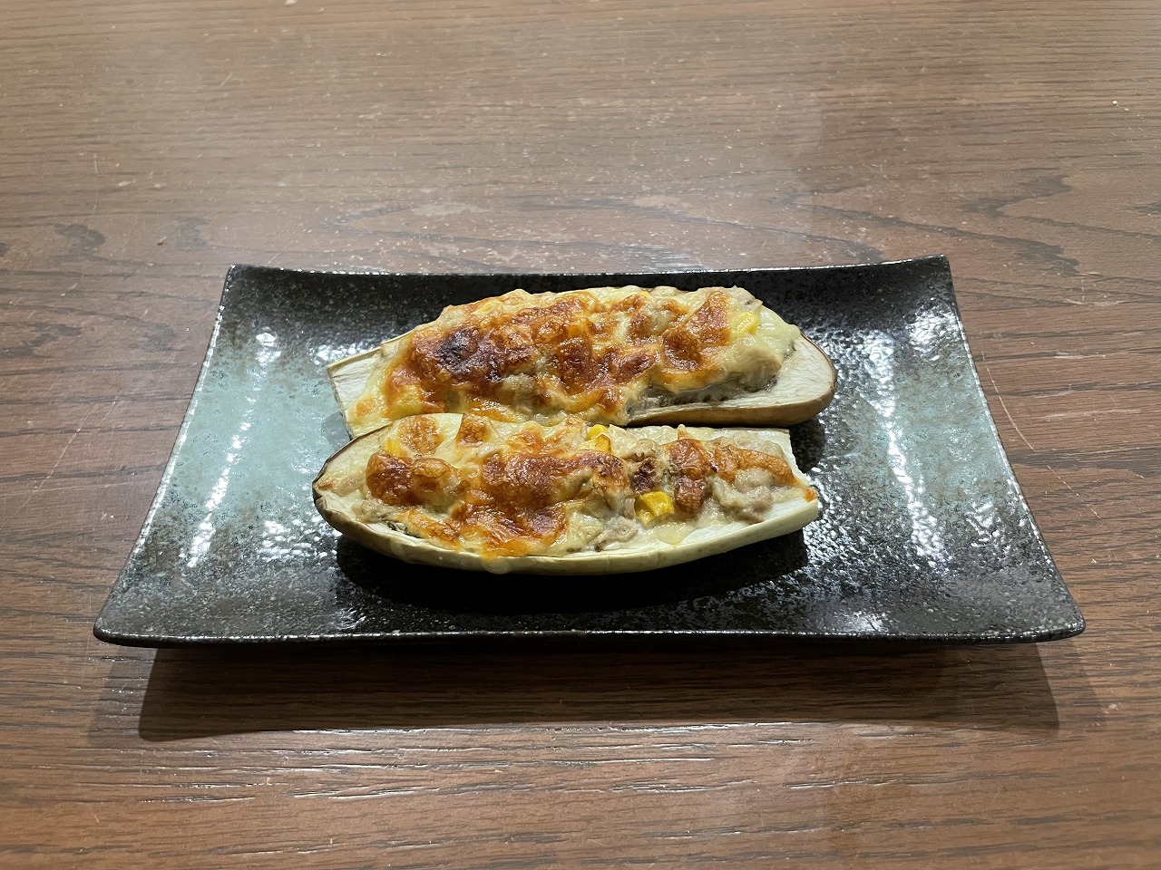 題して、白ナスのツナマヨコーン詰め~チーズをのせて~