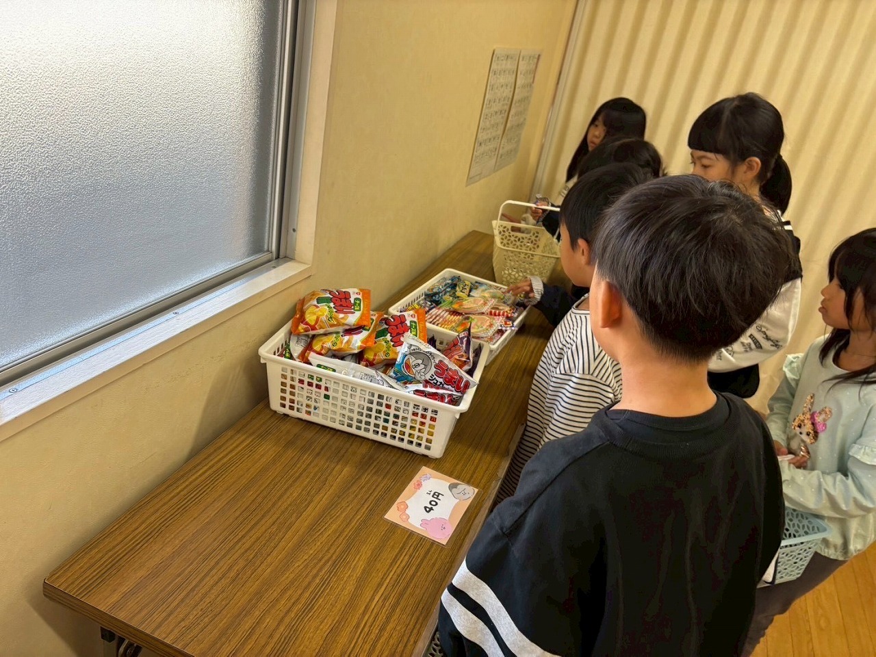 駄菓子販売では、1人100円分の紙のお金を財布に入れ、15円、20円、30円、40円の駄菓子を100円になるように計算しながら、好きな駄菓子を買ってもらいました。