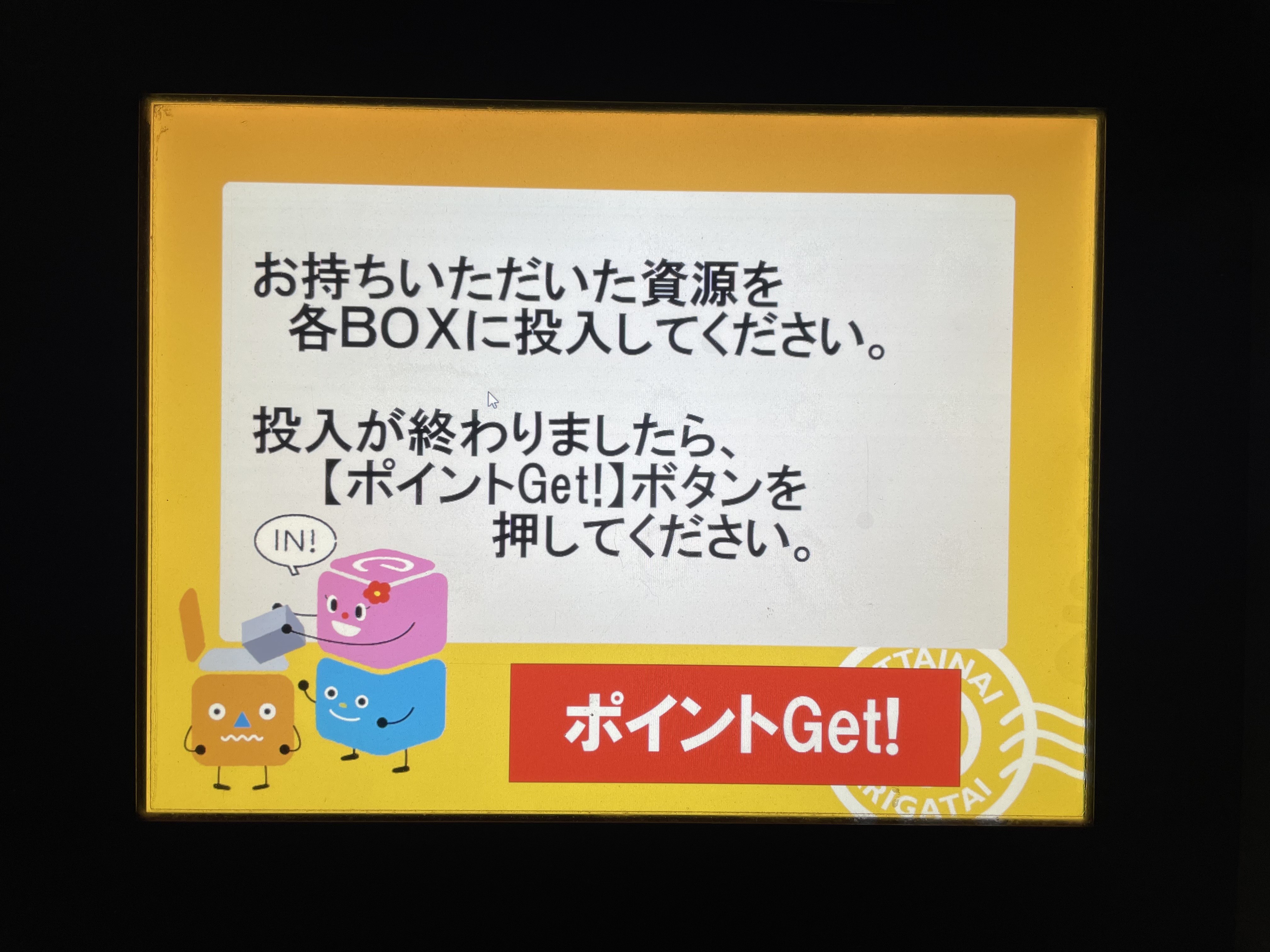 そのため前の方が終わり次第、自分も端末で受付→計量開始となるのですが、たまに前のお客様の投入が終わる前に、次のお客様が「ポイントGet」ボタンを押してしまうトラブルが発生します。