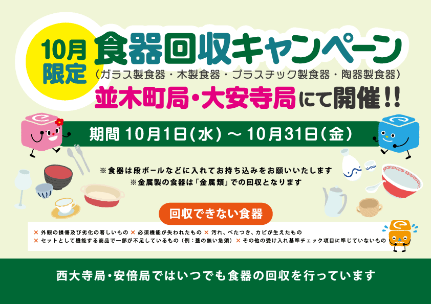 【10月限定】食器回収キャンペーンのお知らせ【並木町局・大安寺局】