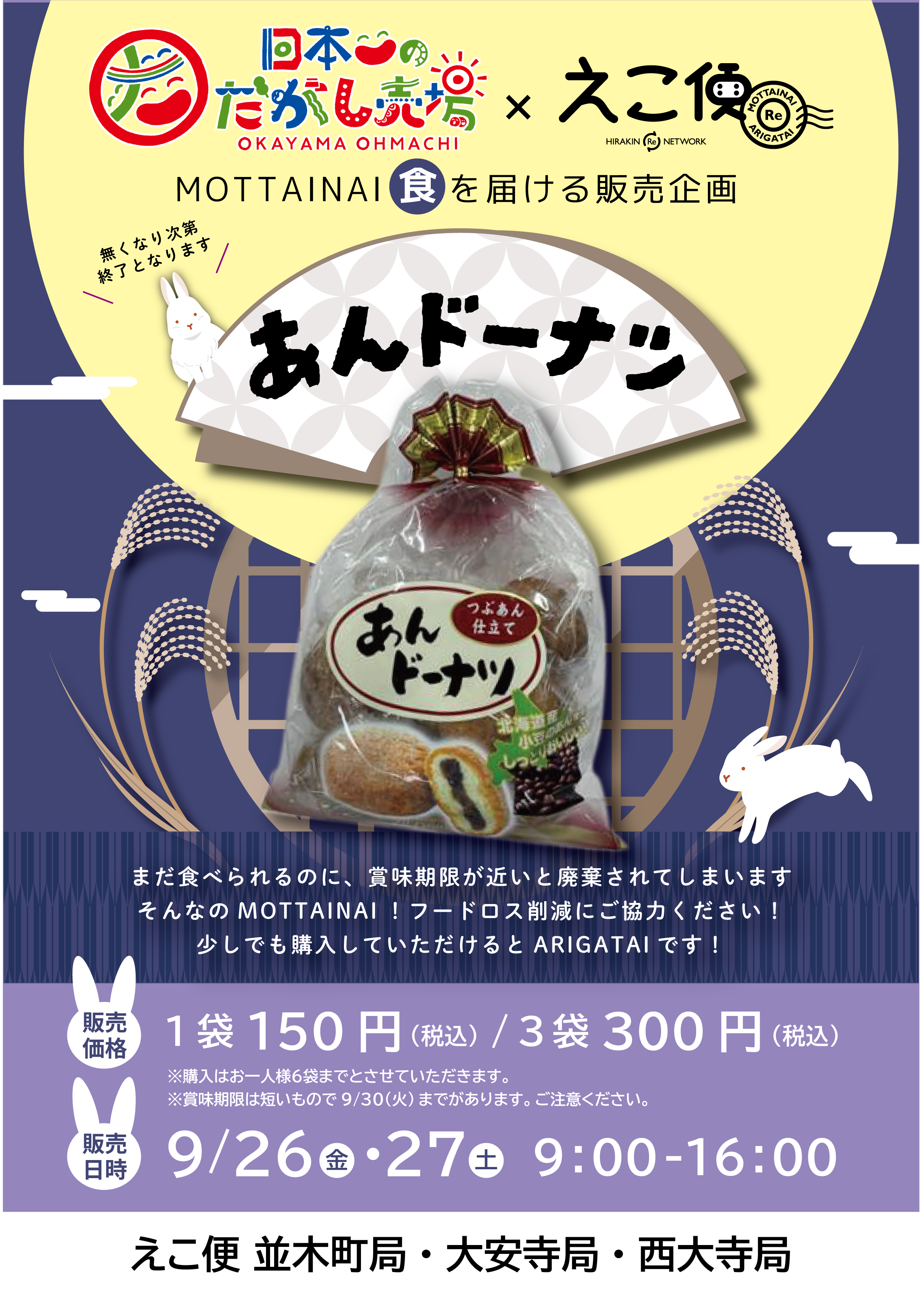 【あんドーナツ】〜MOTTAINAI「食」を届ける販売企画〜【並木町局・大安寺局・西大寺局】