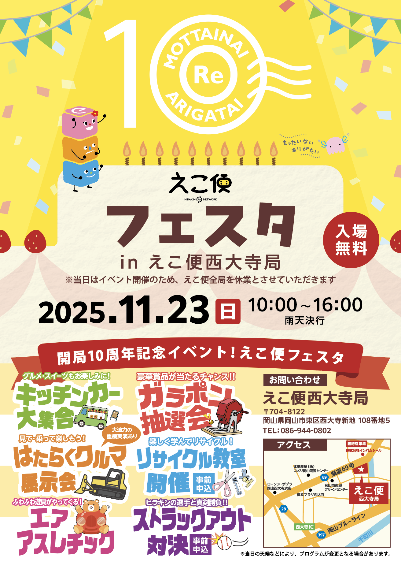 えこ便は開局10周年を記念し、日頃のご愛顧への感謝を込めて11月23日(日) に「えこ便フェスタ」を西大寺局にて開催します!