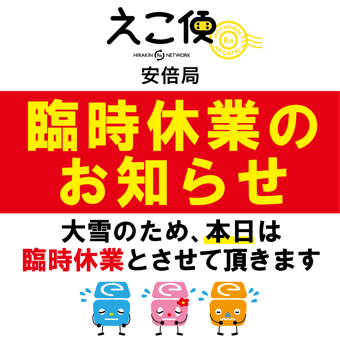 本日は大雪の影響により、安全確保のためえこ便安倍局を臨時休業とさせていただきます。