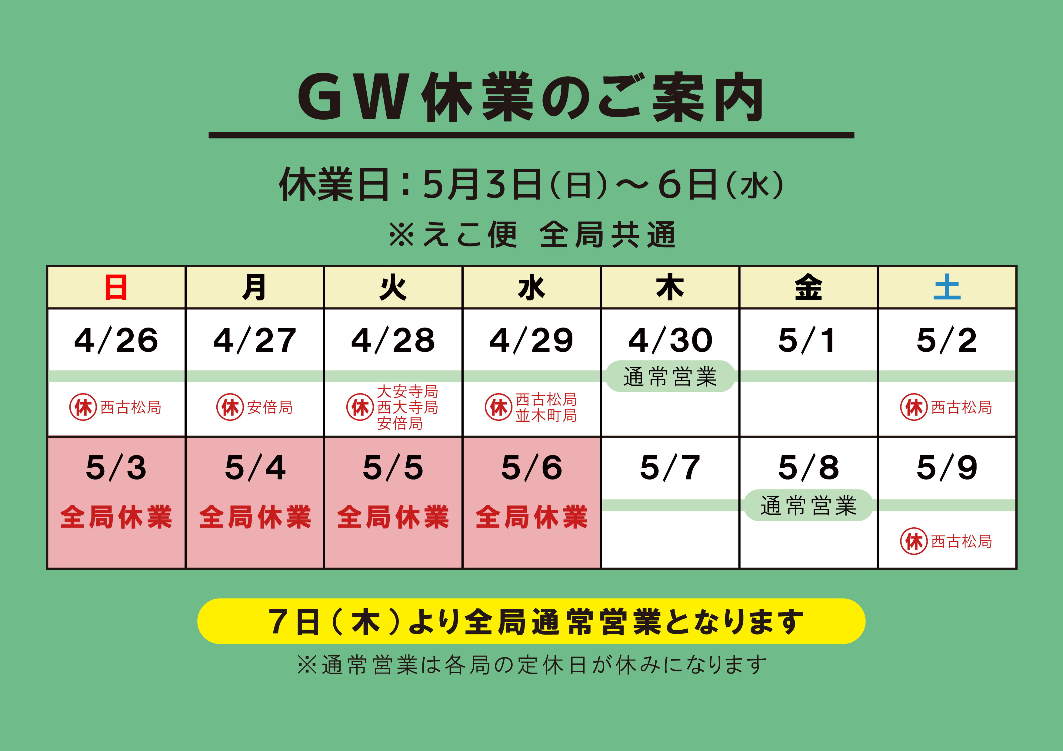 誠に勝手ではございますが、2026年GW期間中は下記の通りお休みとさせていただきます。